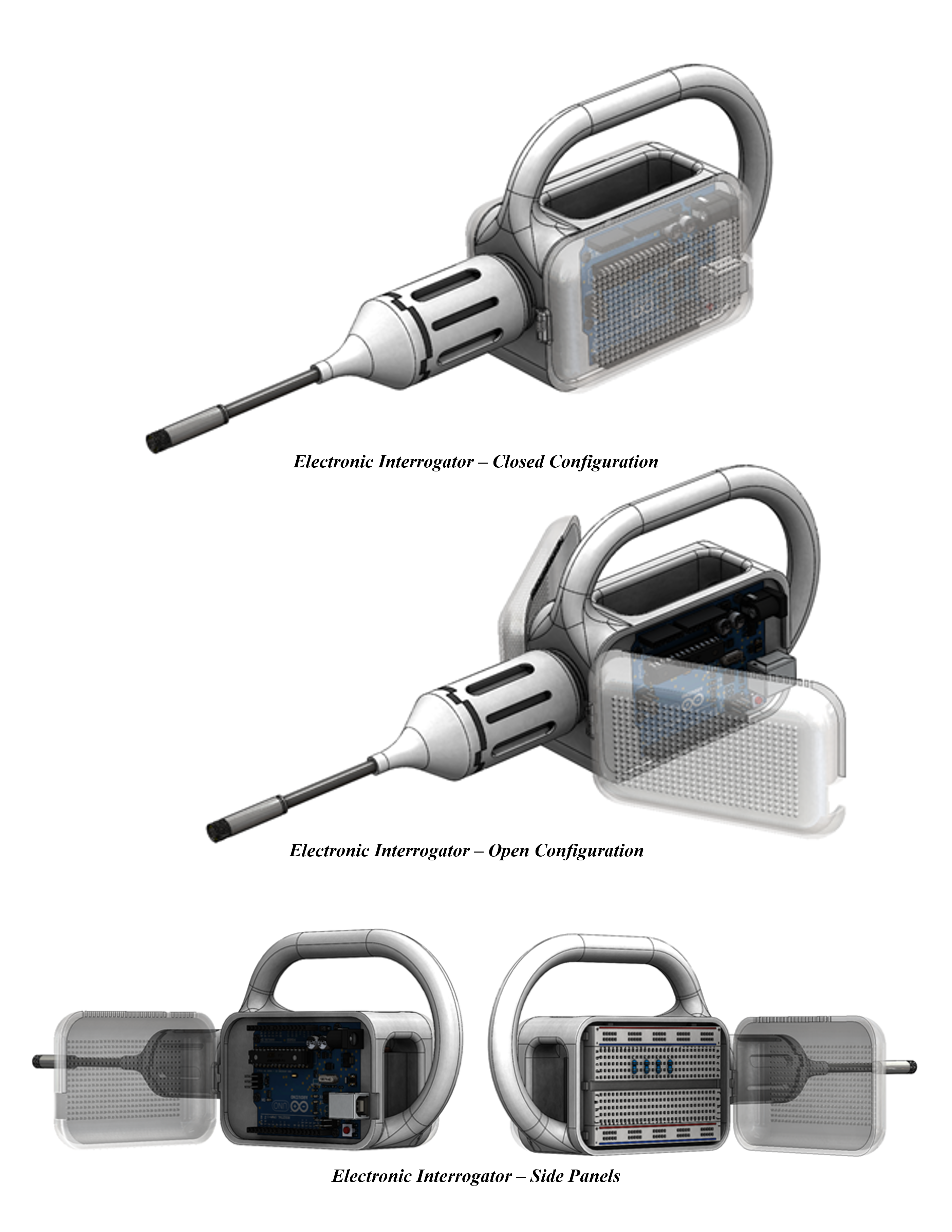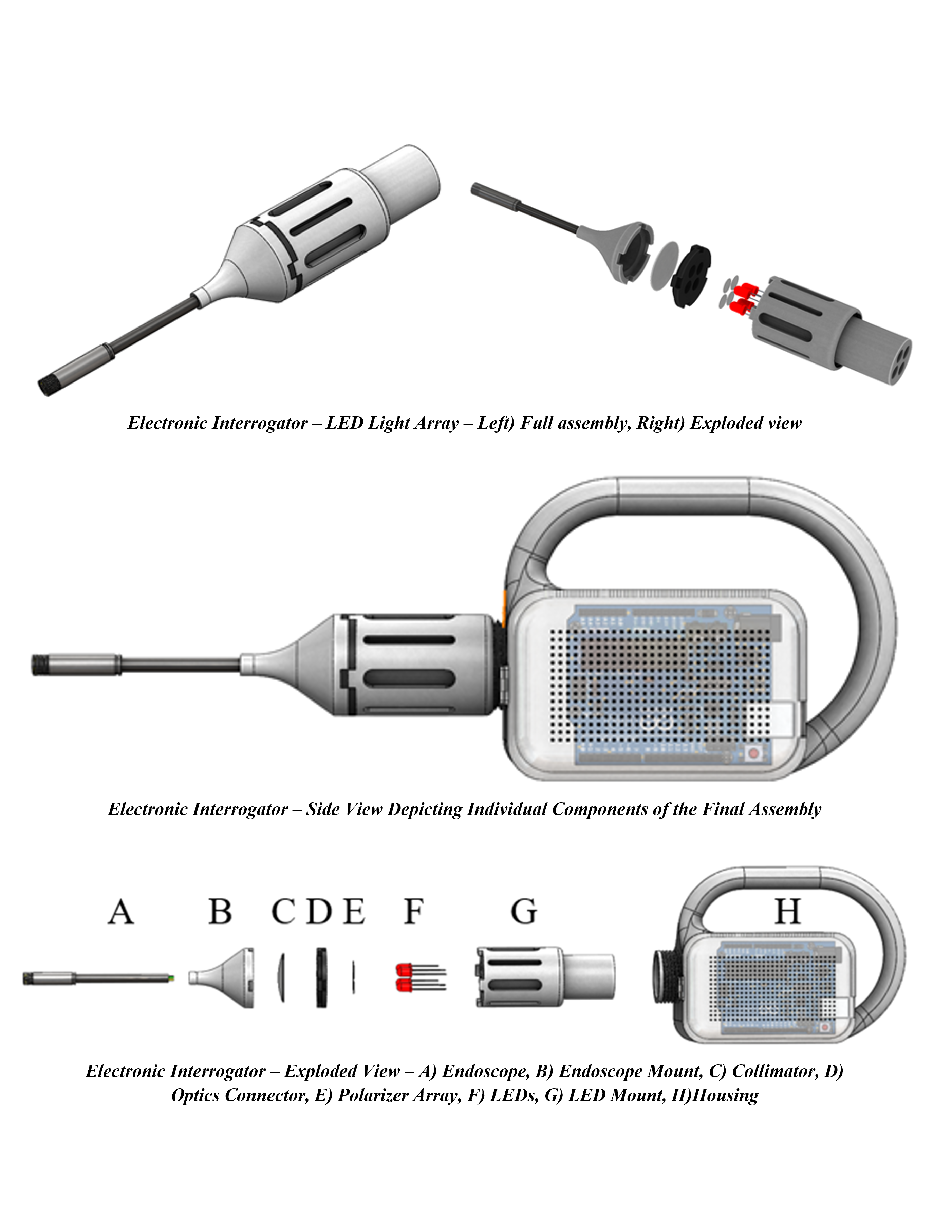 The housing for both interrogators was designed to be handheld, cordless, and contain all necessary components for proper device function. All housing components for both the mechanical and electronic interrogators were designed to be 3D printed for ease of assembly. Each device contained two side panels containing all electronic components. Each panel rested on a hinge, allowing for easy access to the electronic components in the case of troubleshooting. Since the Arduino and other electronic components could have the possibility of overheating, holes were cut into each of the side panels to allow for heat dissipation. At the top of each panel, holes were cut for the wires of the electronic components to be routed into the negative space located centrally within the device. This negative space was intentionally placed to provide a place for all electrical wires to be housed without interrupting the aesthetics or function of the device. Specific connectors were designed and developed to help assemble the individual components of the interrogator. A final attachment was also created to adapt the device for usage with an endoscope. This attachment essentially reduced the diameter of the light from the size of the light source to the size of the endoscope. The device itself can function with or without the usage of the endoscope attachment, however, an attachment was created to integrate the usage of the fiber optics investigated. If fiber optics were to be integrated with the device, we determined that a bow tie fiber optic cable would be used as it allows the light’s unique polarity to be maintained throughout its length.