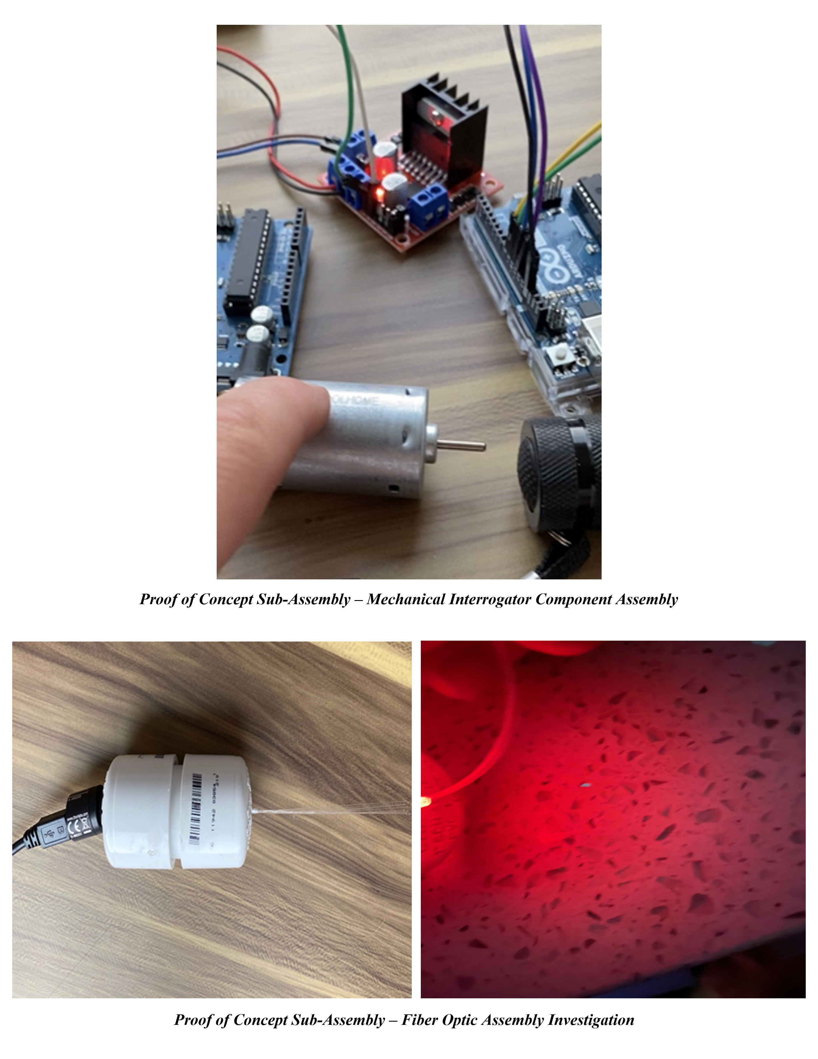 The mechanical interrogator was initially chosen for investigation since its working principle was most closely related to that of which was found in the literature review process. The light within the system would be polarized, collimated, and rotated in a circular fashion to induce the flickering effect of the nerve cells. Aside from the shared components aforementioned, the mechanical interrogator design consisted of LEDs, a mini DC motor, a motor driver module, a flashlight, a collimating lens, polarizing film, and specific attachments and connectors necessary for final assembly. The light array consisted of 5 LEDs retrofitted into a flashlight that rotated via a mini DC motor. The rotating light then shone through a stationary collimating lens and polarized film oriented at one angle to produce the desired nervous tissue response. An L298N motor driver module was used to control the speed and direction of the motor. A PWM signal was used to drive the DC motor which allowed for its speed to be controlled by increasing or decreasing the duty cycle.
